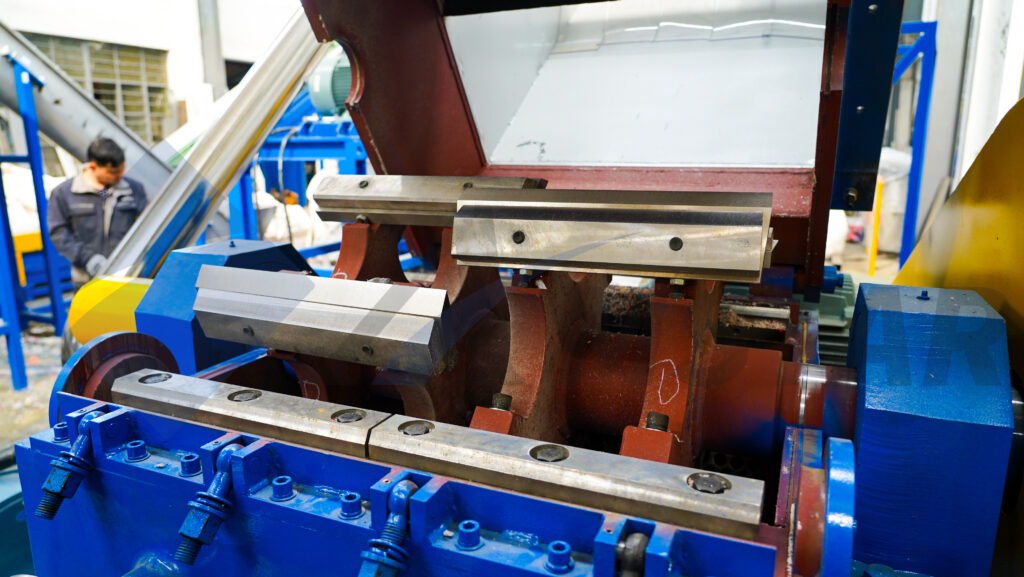 A plastic crusher is a high-speed cutting system consisting of a rotating blade (rotor) and stationary blades (fixed knives), combined with a perforated screen that controls the final flake size. During operation, waste plastics are fed into the cutting chamber, where high-speed shearing forces break down materials into smaller pieces. These uniformly sized flakes (typically 10–18 mm for bottles and 80–120 mm for films) become ideal feedstock for a washing line or pelletizing line.